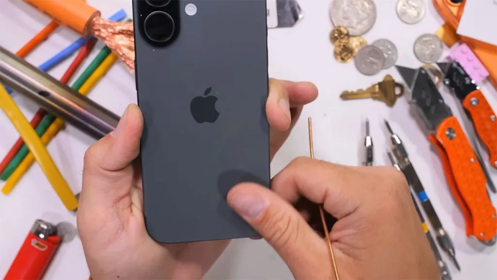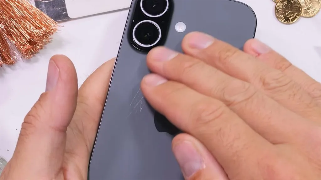 و بالاخره، تست خم شدن. شاید فقط تصور من باشه، ولی یه انعطاف خیلی خیلی جزئی رو تو فریم آلومینیومی حس می‌کنم. وقتی از پشت هم خمش می‌کنم همینه. ولی خیلی زود مشخص میشه که این آیفون ۱۷ ارزون‌تر و اقتصادی‌تر، تست مقاومت من رو با موفقیت کامل پشت سر میذاره. آیفون ۱۷ یه گوشی فوق‌العاده جون‌سخته، و اگه اپل همین سطح از مقاومت رو ادامه بده، من از کار بیکار میشم. ولی حداقل الان می‌دونیم چی روی شیشه پشتی رد دائمی جا میذاره.