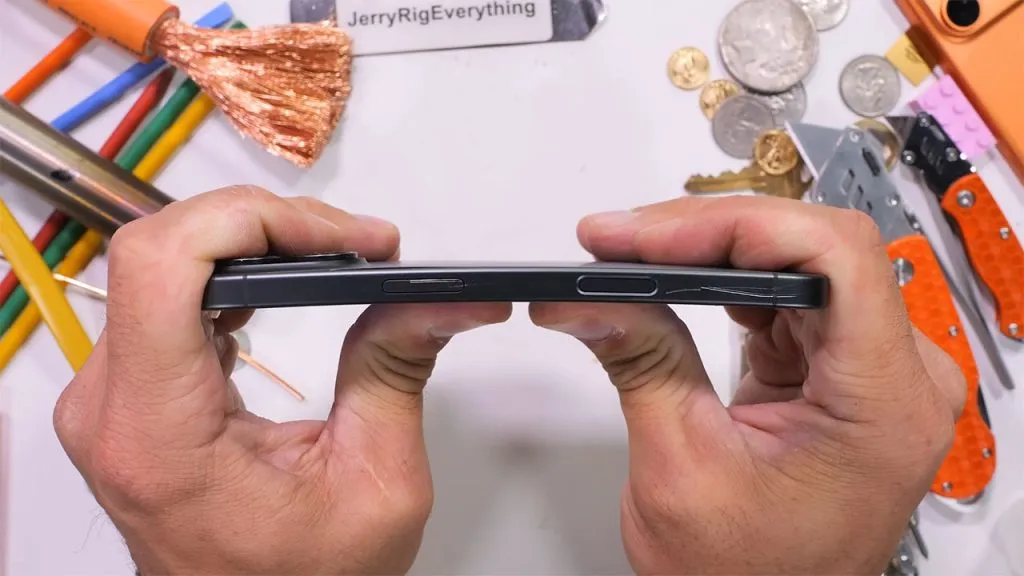 اینجا روی لبه کناری هنوز دکمه کنترل دوربین رو داریم. و اگه این گوشی موقع تست خم شدن از وسط نصف بشه، احتمالا دقیقا از همین‌جا می‌شکنه که برای این دکمه‌ای که هیچکس ازش استفاده نمی‌کنه، بدنه رو خالی کردن. آیفون ۱۷ مثل گوشی‌های اخیر گوگل و سامسونگ دکمه‌های قابل جدا شدن نداره. و خطوط پلاستیکی آنتن رو هم در امتداد لبه فریم می‌بینیم که به سیگنال اجازه میده از گوشی خارج بشه. بدون این خطوط آنتن، آیفون ۱۷ عملا تبدیل به یه قفس فارادی می‌شد و تمام سیگنال‌ها رو داخل خودش حبس می‌کرد.