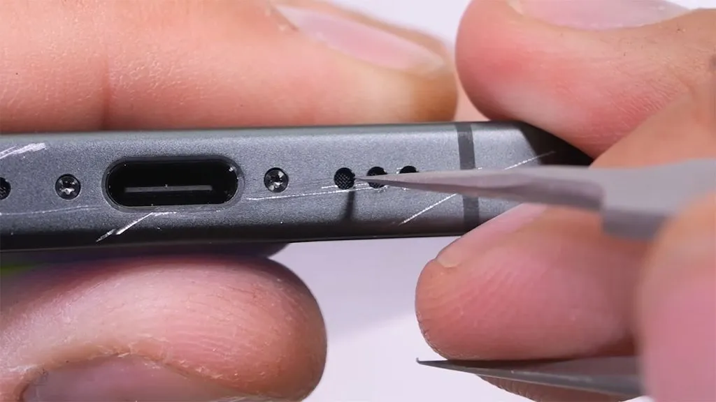 روی دهانه‌های اسپیکر و میکروفون هم یه توری فلزی برای گواهی ضدآب IP68 داریم.