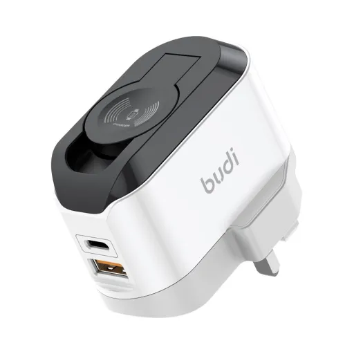 شارژر دیواری 20 وات بودی مدل Budi AC330WEW دو پین با یک خروجی USB، یک خروجی USB-C و یک خروجی شارژ بی سیم ساعت با گارانتی ۱۸ ماهه شرکتی (۶ ماه تعویض)