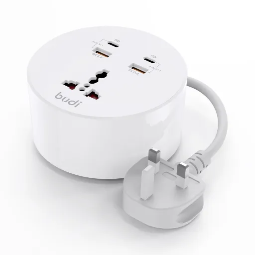 شارژر دیواری 36 وات بودی مدل Budi M8J308RE دو پین با دو خروجی USB، دو خروجی USB-C و یک خروجی برق شهری دارای کابل 1.5 متری با گارانتی ۱۸ ماهه شرکتی (۶ ماه تعویض)