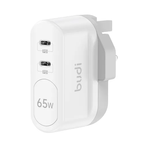 شارژر دیواری 65 وات بودی مدل Budi AC326RUW سه پین با دو خروجی USB-C و سری قابل چرخش با گارانتی 18 ماهه شرکتی (6 ماه تعویض)