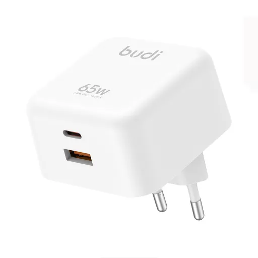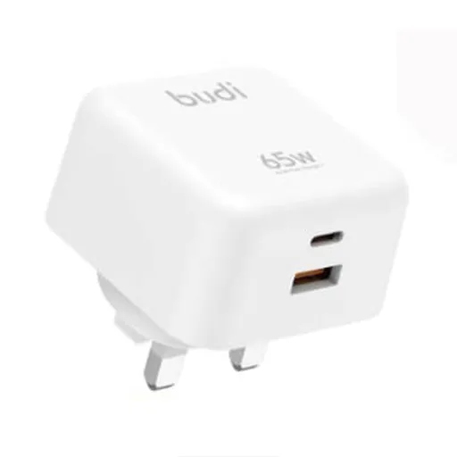 شارژر دیواری 65 وات بودی مدل Budi AC320EW دو پین با یک خروجی USB و یک خروجی USB-C با گارانتی 18 ماهه شرکتی (6 ماه تعویض)