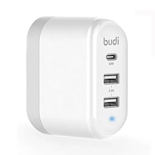 شارژر دیواری 38 وات بودی مدل Budi AC328UW سه پین با یک خروجی USB و یک خروجی USB-C با گارانتی 18 ماهه شرکتی (6 ماه تعویض)