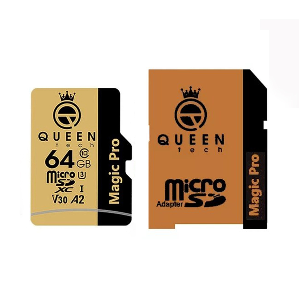 کارت حافظه میکرو اس دی 64 گیگابایت کویین تک مدل QueenTech MicroSD XC CL10 U3 633X Magic Pro UHS-I V30 A2 4K به همراه آداپتور با گارانتی مادام العمر شرکتی