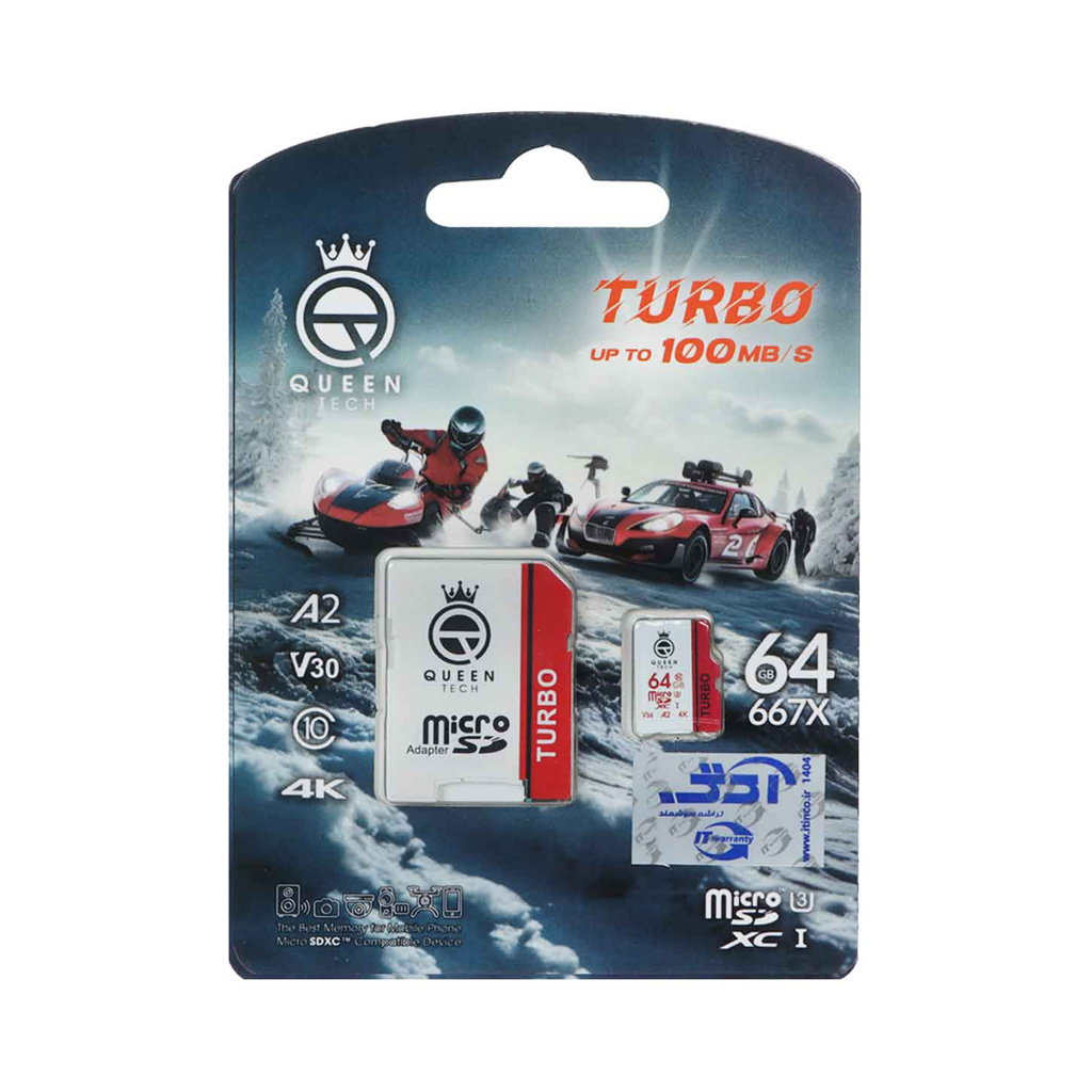 کارت حافظه میکرو اس دی 64 گیگابایت کویین تک مدل QueenTech MicroSD 667X Turbo XC CL10 U3 UHS-I V30 A2 4K با گارانتی مادام العمر شرکتی