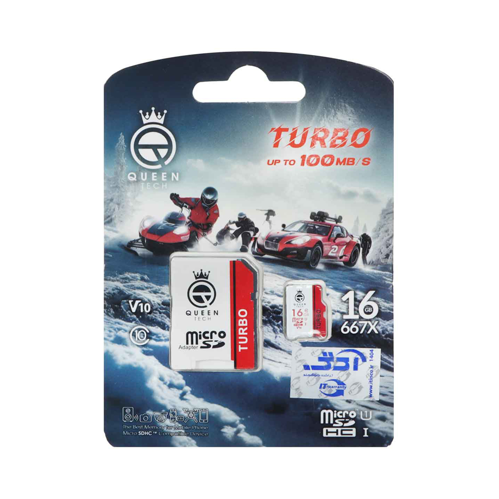 کارت حافظه میکرو اس دی 16 گیگابایت کویین تک مدل QueenTech MicroSD 667X Turbo HC CL10 U1 UHS-I V10 با گارانتی مادام العمر شرکتی