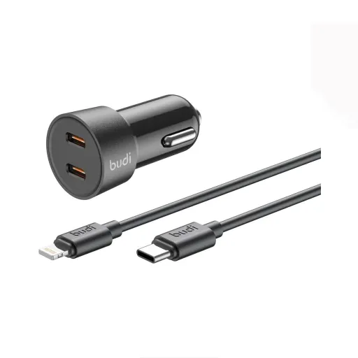 شارژر فندکی 33 وات بودی مدل Budi CC622RTLB با دو خروجی USB-C و کابل شارژ USB-C به لایتنینگ با گارانتی ۱۸ ماهه شرکتی (۶ ماه تعویض)