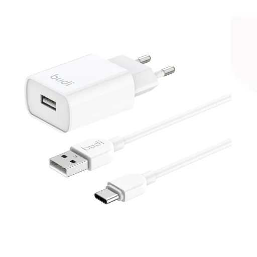 شارژر دیواری 12 وات بودی مدل Budi AC356ET10W دو پین با یک خروجی USB به همراه کابل USB به USB-C به طول 1 متر با گارانتی 18 ماهه شرکتی (6 ماه تعویض)