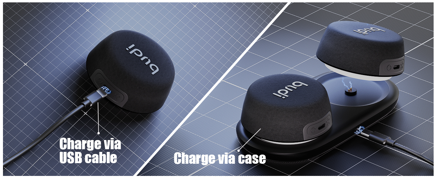 کیس شارژ دوکاره کیس شارژ بیسیم، اسپیکرها را همیشه آماده نگه میدارد و بهعنوان پایه نگهدارنده گوشی نیز قابل استفاده است. همچنین امکان شارژ مستقل هر اسپیکر از طریق پورت USB-C فراهم است.
