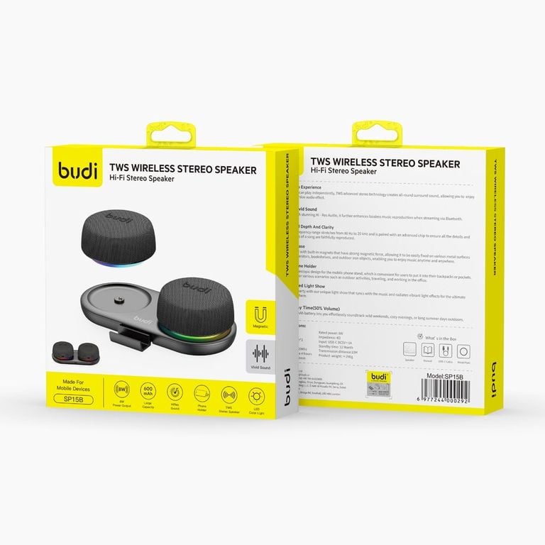 اسپیکر بیسیم مغناطیسی BUDI مدل SP15B – صدای قدرتمند در طراحی هوشمند