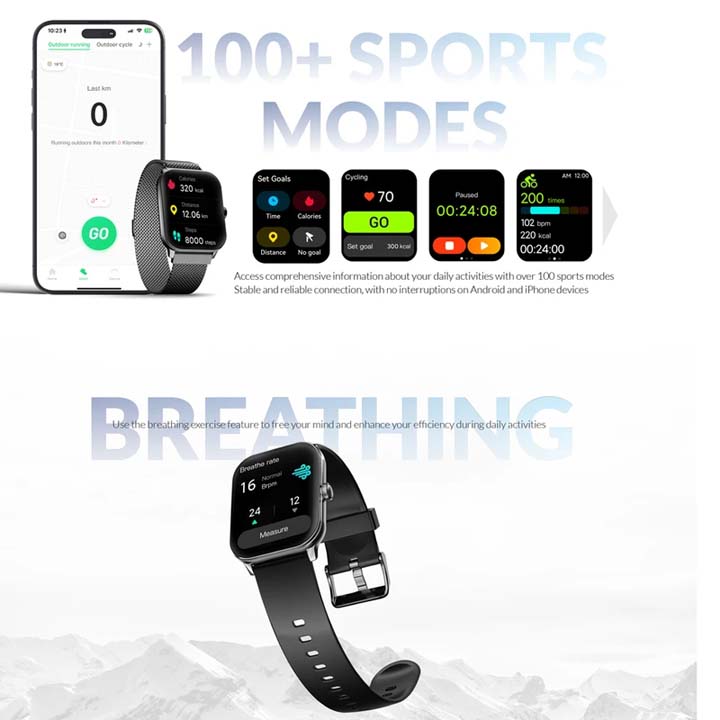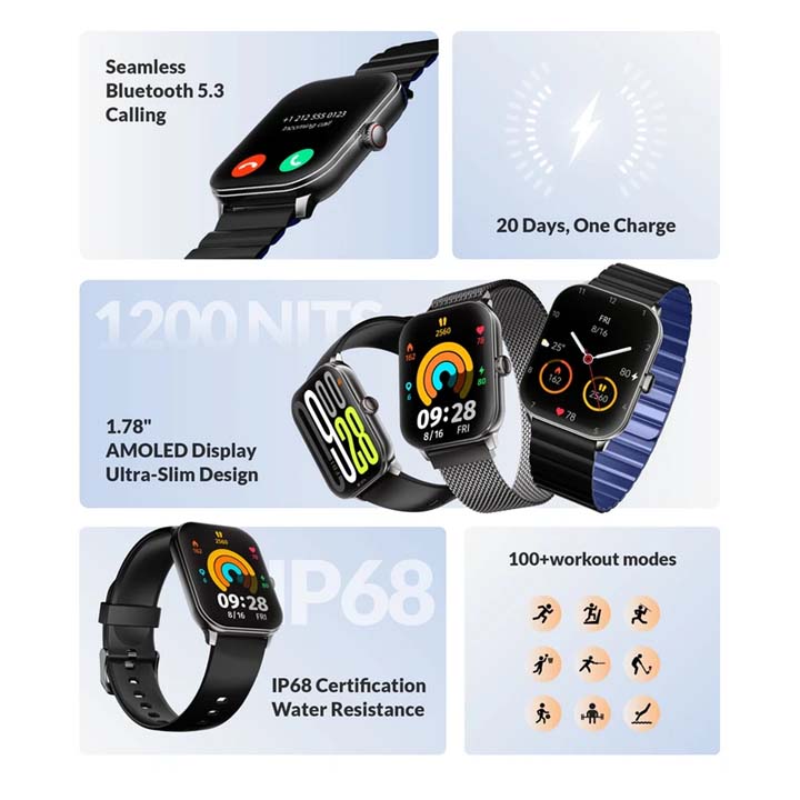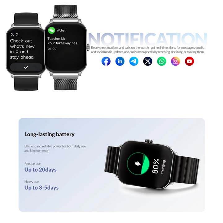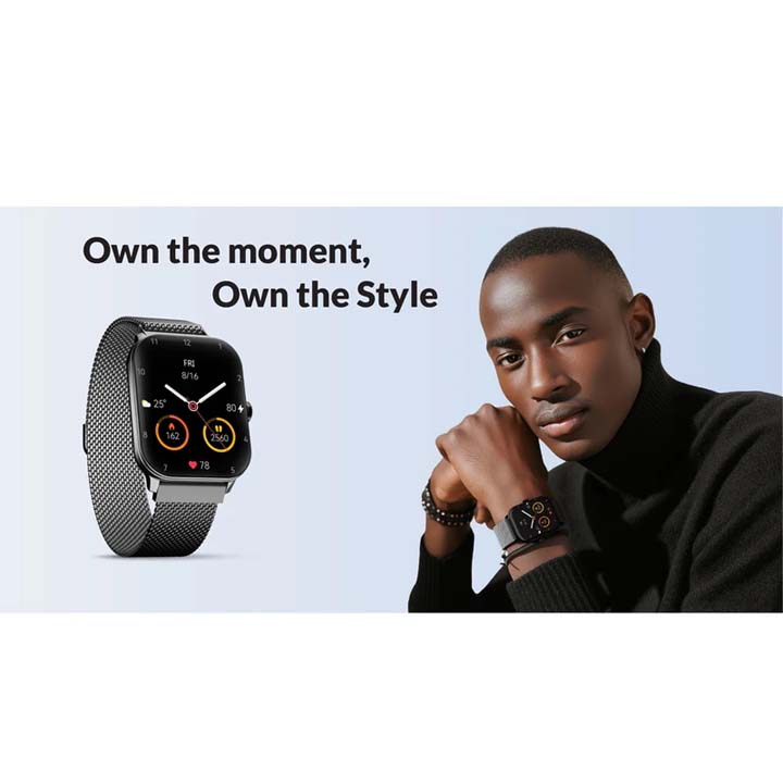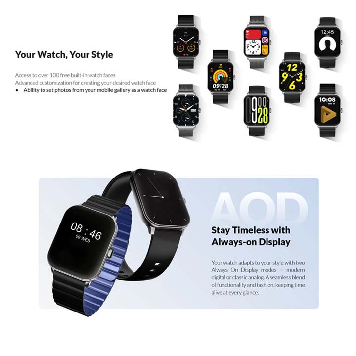 جنس بدنه: بدنه ترکیبی از پلیکربنات (PC) و کامپوزیت همراه با دکمه ساختهشده از استیل ضدزنگ ۳۰۴L/ مجهز به دکمه چرخان (Rotating Crown Button) برای کنترل سریع و آسان منوها