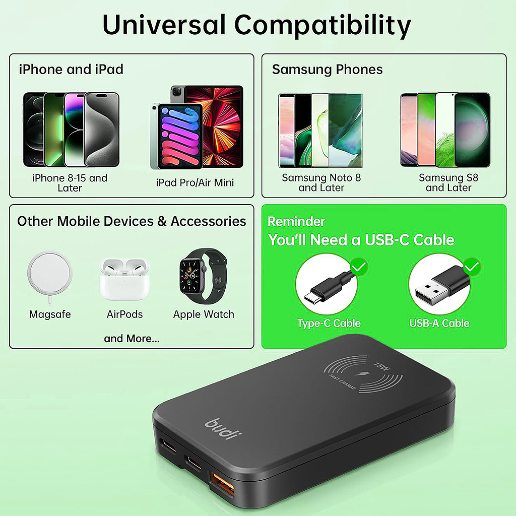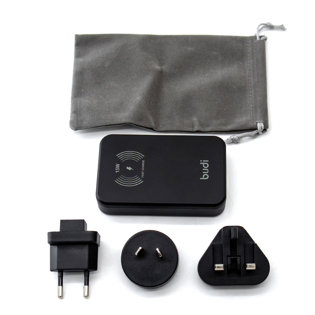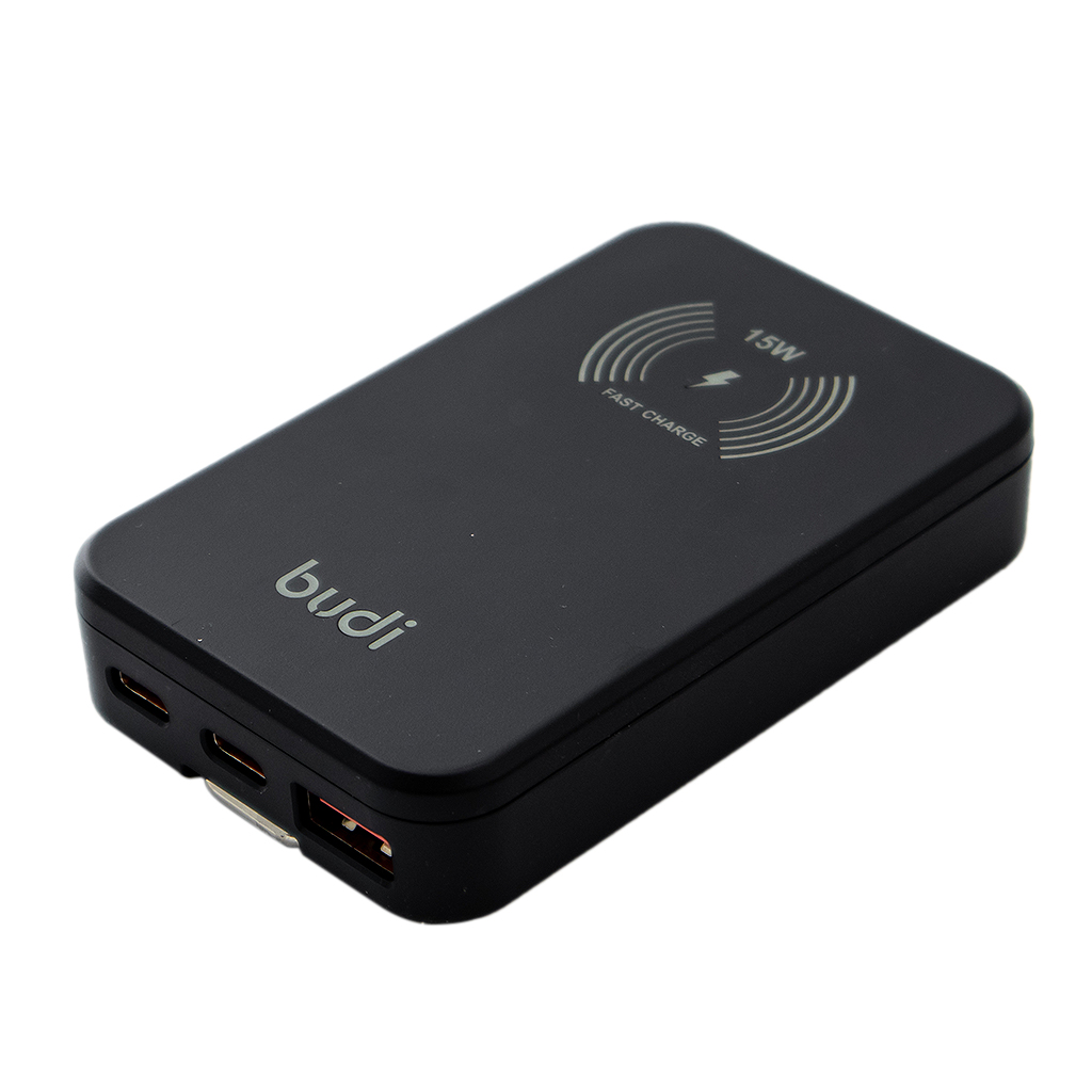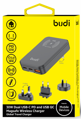 شارژر 30 وات بودی مدل Budi AC336WSB با دو خروجی USB-C، یک خروجی USB و شارژر بی سیم با گارانتی ۱۸ ماهه شرکتی (۶ ماه تعویض)