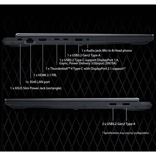 سایر توضیحات درگاههای ارتباطی: دو عدد USB-C (یک عدد Thunderbolt ۴ با سرعت ۴۰ گیگابیت بر ثانیه و پشتیبانی از DisplayPort و G-SYNC، یک عدد USB ۳.۲ Gen۲ با سرعت ۱۰ گیگابیت بر ثانیه و پشتیبانی از DisplayPort و شارژ) / سه عدد USB-A (Gen۲ با سرعت ۱۰ گیگابیت بر ثانیه)
