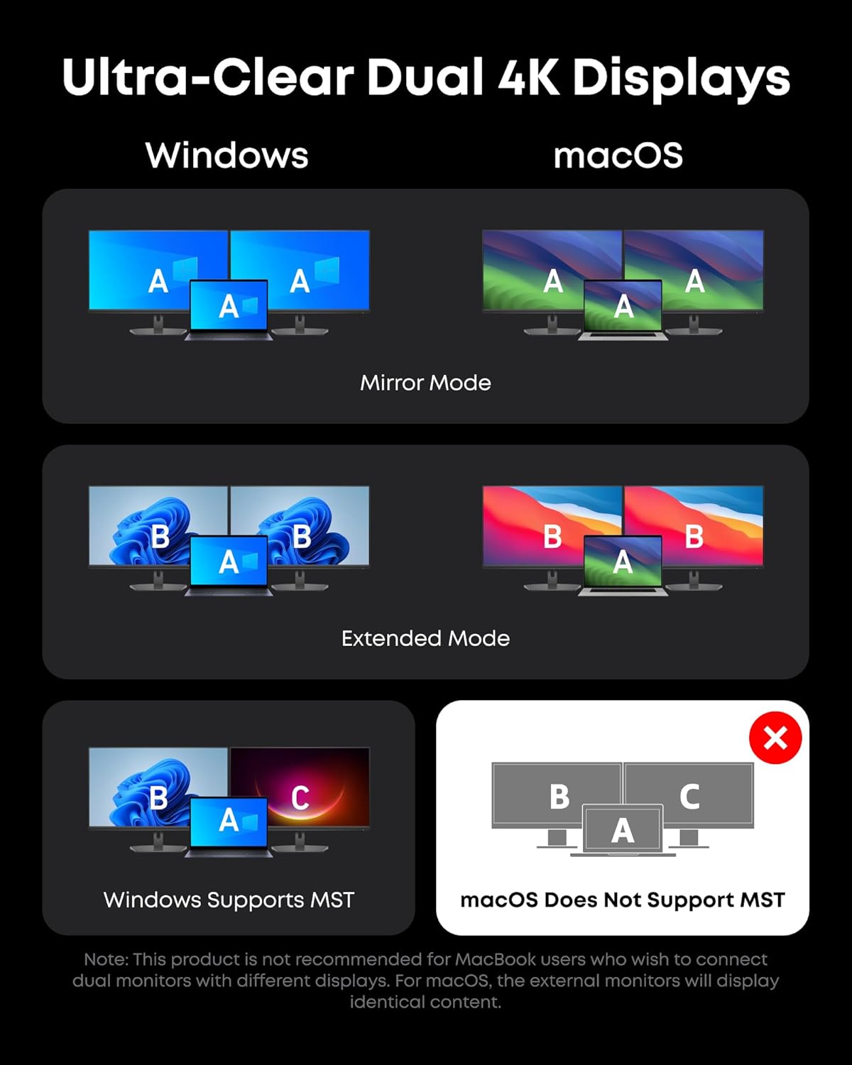 پشتیبانی از نمایشگر دوگانه با HDMI 4K (تا 2K@60Hz یا 1080p@60Hz بسته به لپ‌تاپ)