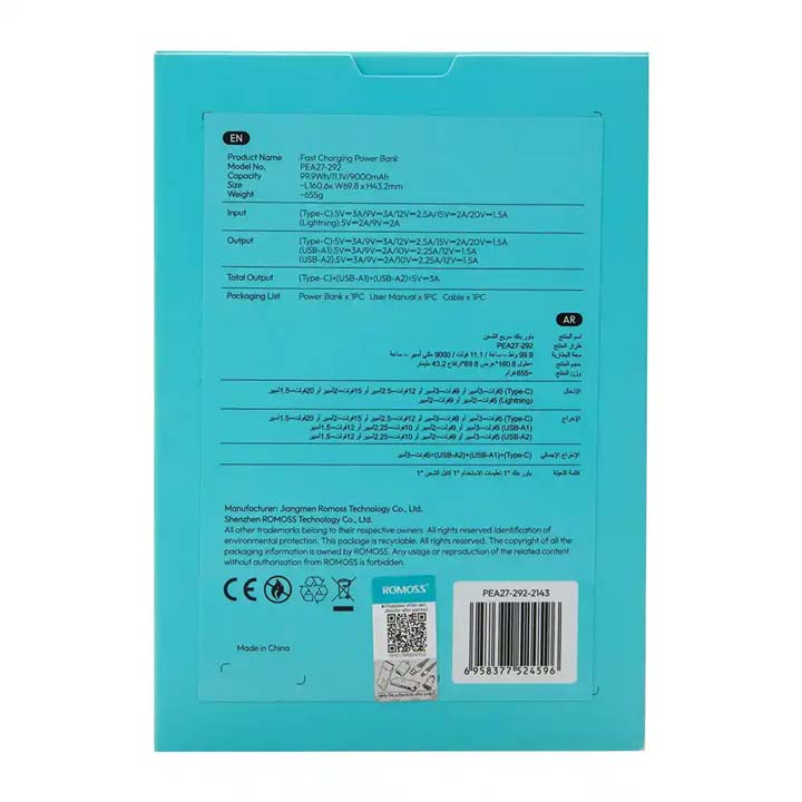 پاوربانک 27000 میلی آمپر روموس 30 وات مدل Romoss PEA27-292 با گارانتی 12 ماهه شرکتی